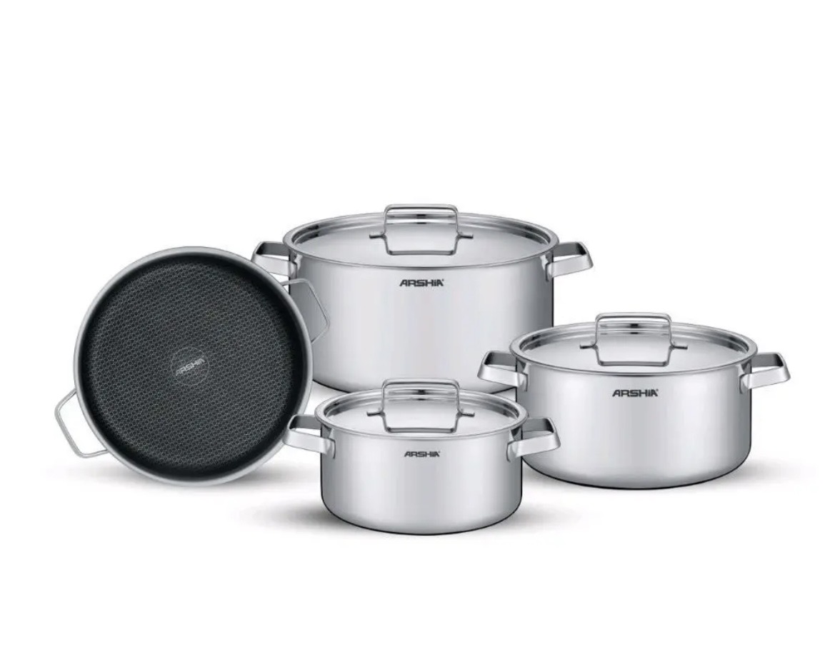 با این سرویس قابلمه استیل ضد زنگ سه لایه ممتاز، عملکرد حرفهای را به آشپزخانه خود بیاورید. هر قابلمه و ماهیتابه که برای پخت و پز روزمره طراحی شده است